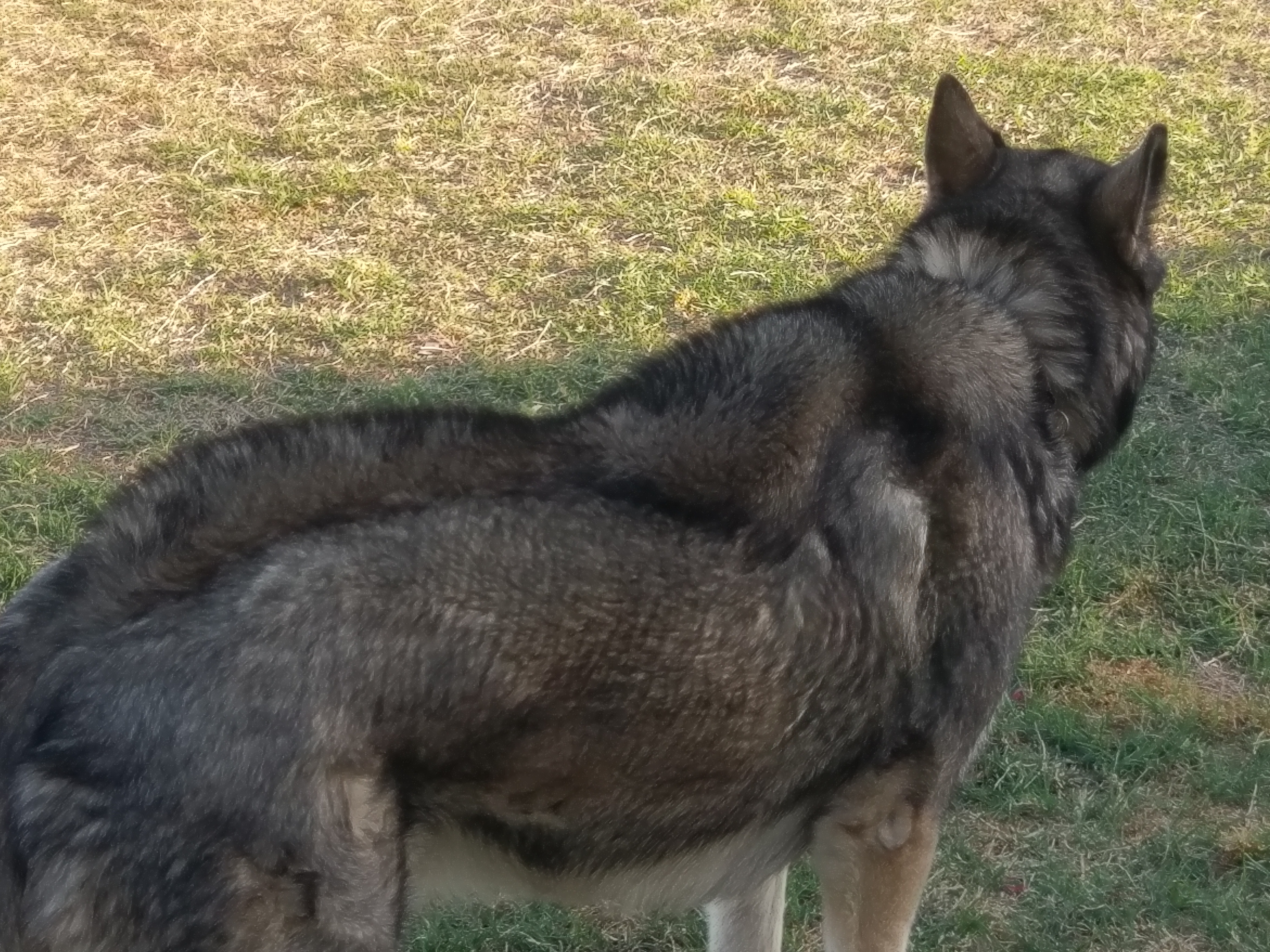 I am still working on "My Theory" that the Harness top is smothering his "Hackels". A neighbor got a German Shepherd last