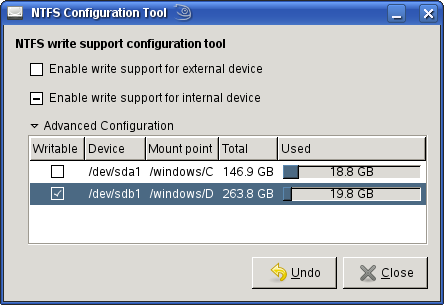 #Device Mountpoint Filesystem Parameters /dev/disk/by-label/win /windows/C ntfs-3g user,users,gid=users,umask=0002,locale=en_US.UTF-8 0 0 Downloaded and installed ntfs-config via YAST. Need to test it out. The first item to check is ntfs-config. This is executed in "root" at the command line. You will be